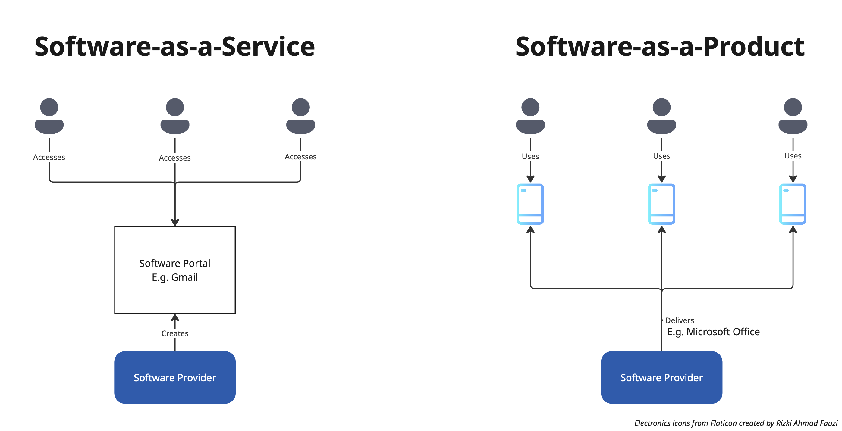 In SaaS, a software provider builds the software and users access the software via a common portal. An example is Gmail. In SaaP, a software provider builds teh software and delivers it to user devices. Examples include Adobe Photoshop or Microsoft Office. Of course, these are two end of a spectrum. There are a million shades of grey in-between, like how Google develops a Gmail app and it is being used on users’ phones or how Microsoft allows for on-premise deployment of its SaaS products.