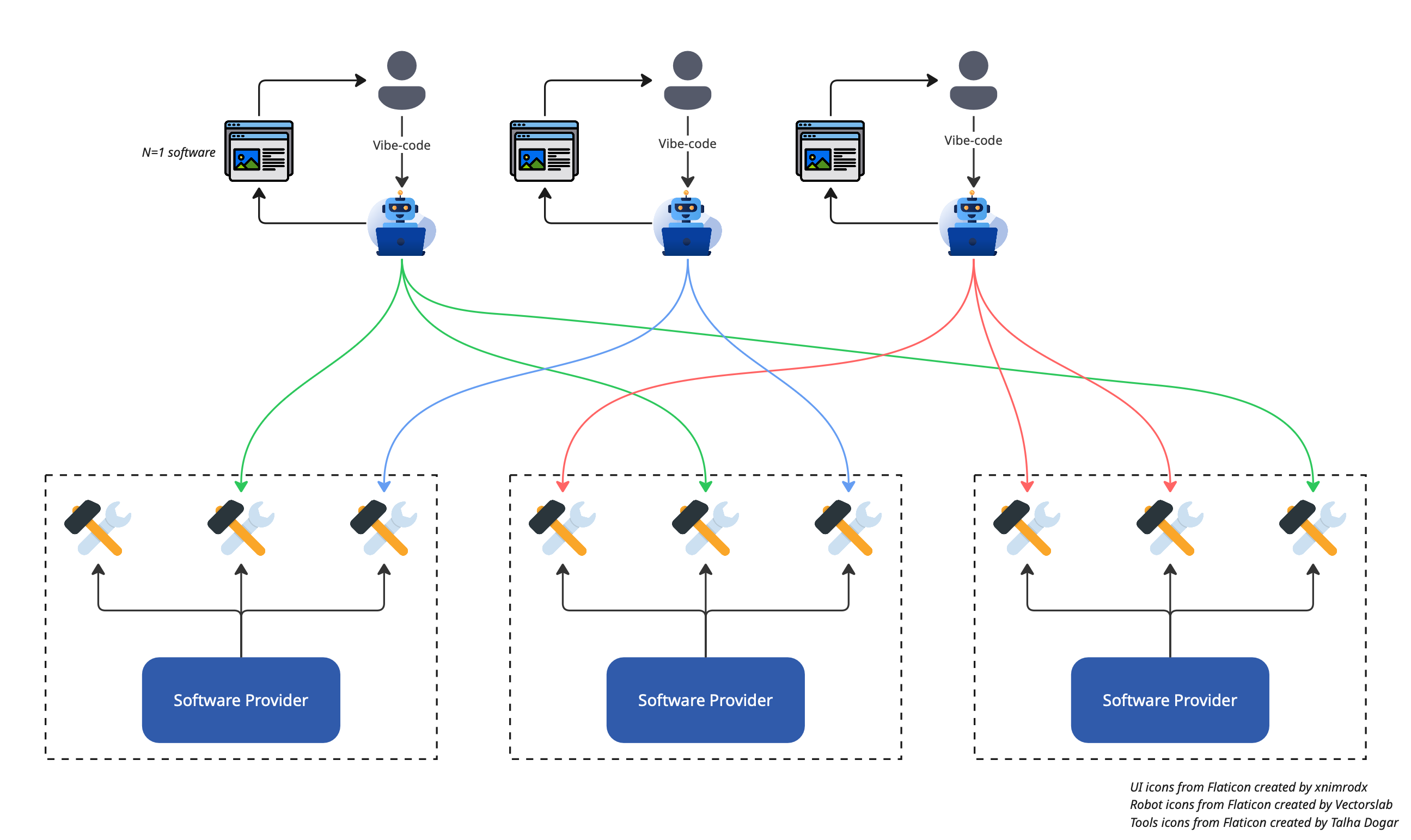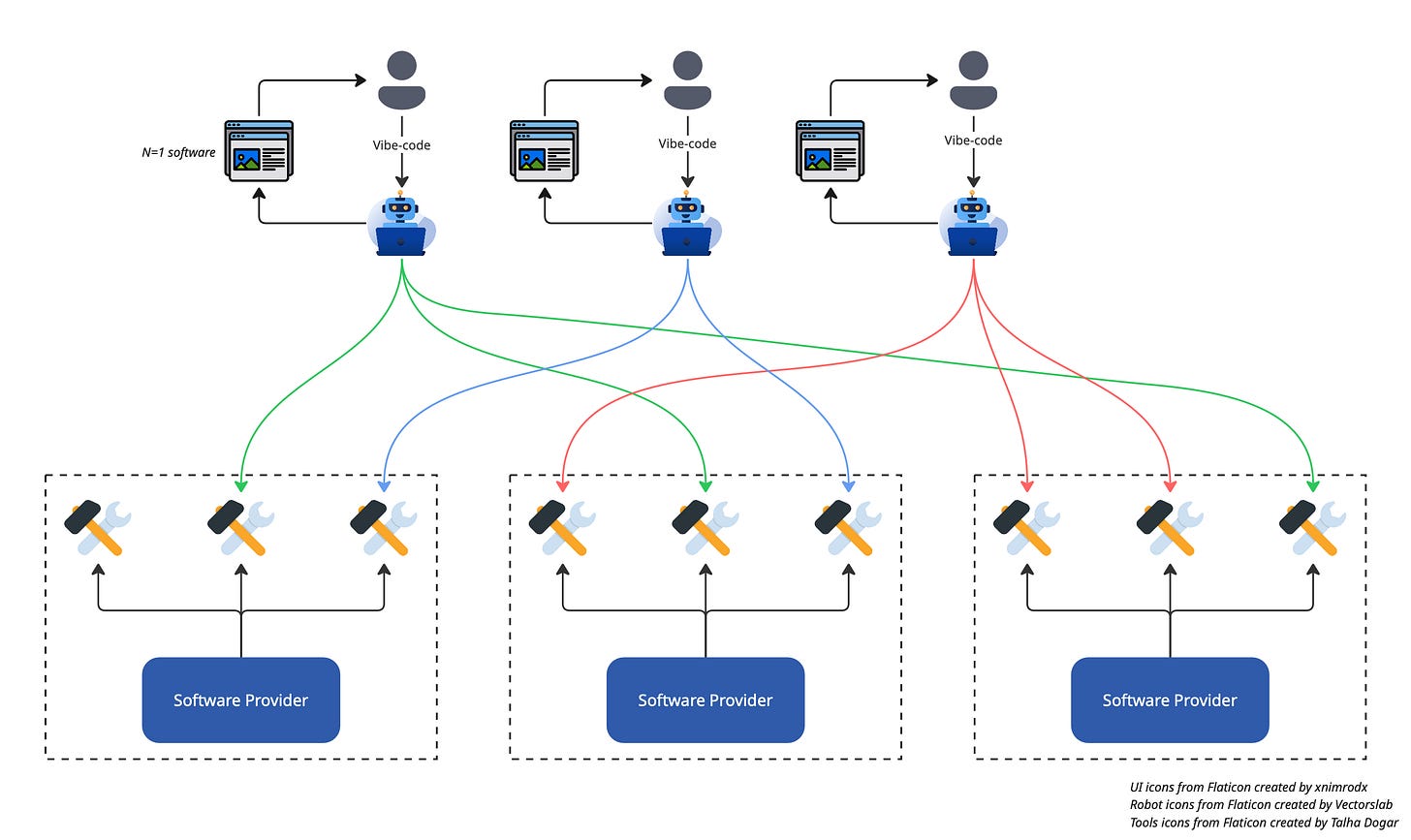 Software providers will no longer take care of end-to-end user journeys. Software providers will simply provide small piece-meal functions, which in today’s agentic AI parlance are called tools, to be consumed by autonomous agents. Software providers as we know them today will retreat into the background just like how IT networking has retreated into the background of web-application development. This is where software development practices will continue to live on.