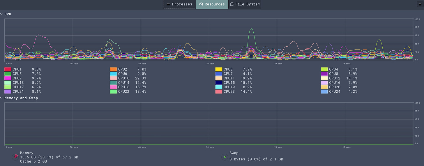 The figure below shows the resource usage while I was making the 10 million requests. As can be seen, my workstation remained calm and collected.