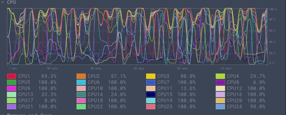 This is a good improvement. I was able to launch up to 1 million requests in ~5 mins. However, I ran into OutOfMemory errors when I tried to run 10 million requests. On top of that, my workstation was working extremely hard. All 24 cores were almost at 100% utilization (see figure below). This does not seem right.