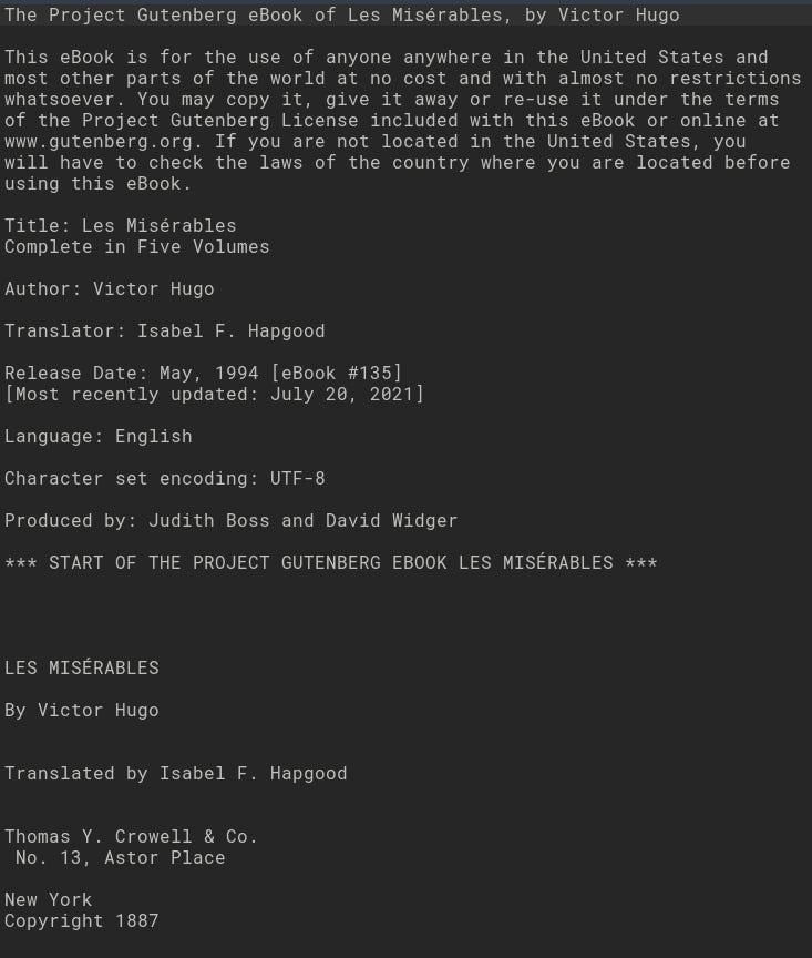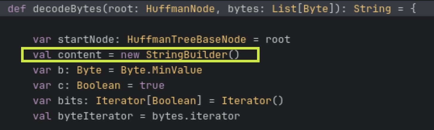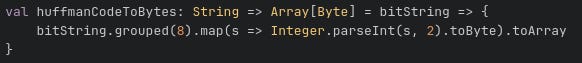 The next thing I found is that although in Scala characters are 2 bytes by default, like in Java, some characters can take more than 2 bytes. If the characters are your run-of-the-mill characters you see in English texts then you can assume a 2-byte representation. But that is not the case in general. It is definitely not the case for the challenge text which is the Les Miserables script which contains European accented characters (or if you want to encode Chinese or Japanese texts).