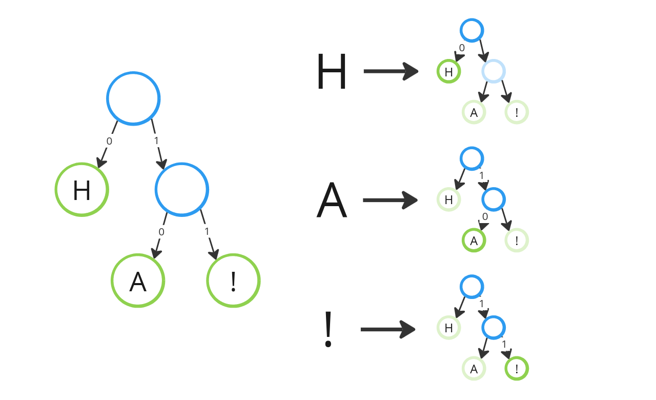 For the Huffman code tree in our example above, we would have Map(‘A’ → 0, ‘H’ → 10, ‘!’ → 11).