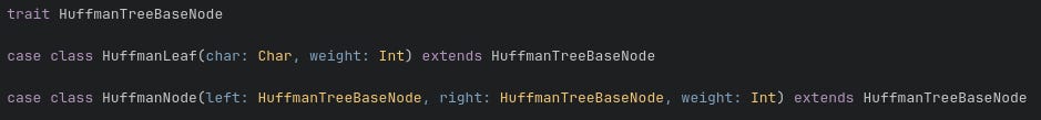 Each node also has a weight attribute. For the leaf node, the weight attribute is the frequency with which its character appears in the text. For the branch node, the weight attribute is the sum of the weight of both its branches. The tree definition code is shown below.