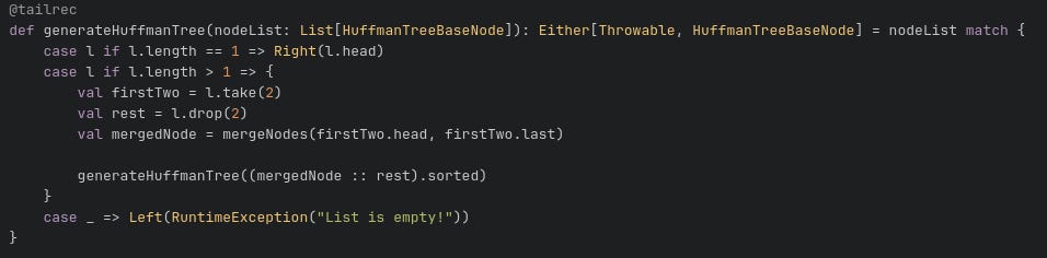 This is a recursive function that takes a list of Huffman tree nodes that are sorted and repeatedly merges the first two lowest weight nodes until only the root node is left.