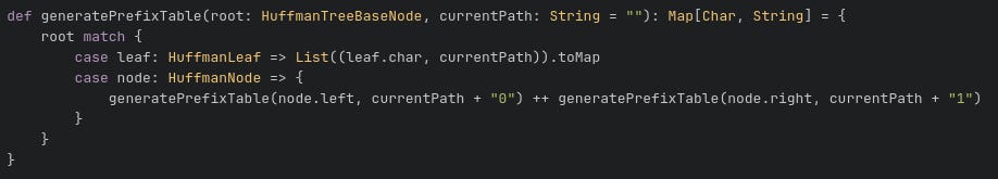 We then look through all the leaf nodes of the Huffman code tree and retrieve their paths from the root node via the generateFilePrefixTable function. The result is a map of the character to its path.
