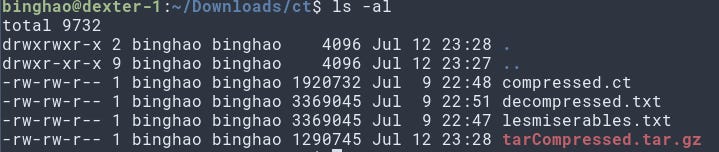 The test file is the Les Miserables text, which is around 3.36 MB. The compressed file from my compression tool resulted in a file that is around 1.92 MB (compressed.ct).