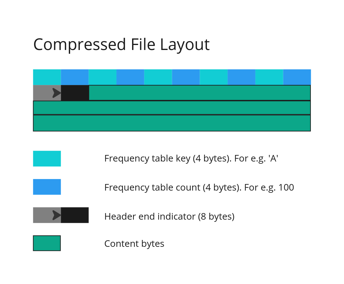 The compressed file would start with a header section which consists of the frequency table where each character is encoded as 4 bytes followed by 4 bytes that represent the count of the character in the file. This is then followed by 8 bytes representing “0”0. The array of bytes representing the encoded Huffman tree paths are then written last. See the layout of the compressed file below.