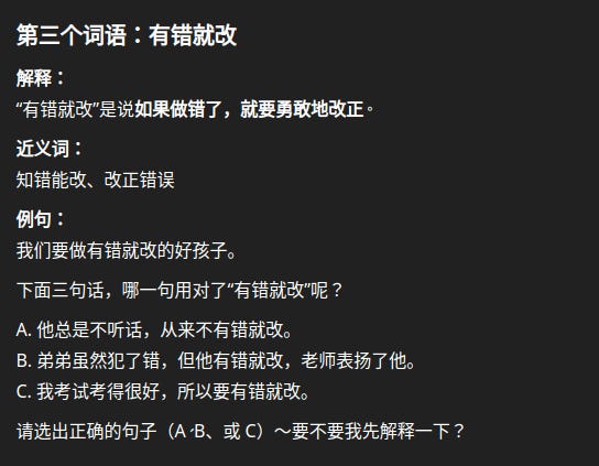 Basically, I uploaded a copy of my daughter’s primary school Chinese curriculum and asked chatGPT to generate explanations, example sentences and simple multiple choice questions to test her understanding.