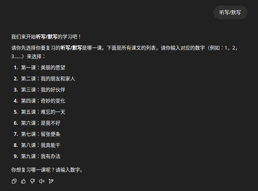 What I did was to construct a custom GPT on ChatGPT to help my daughter revise her Chinese spelling. The prompt used to generate the GPT, which I call 熙师, is shared here.