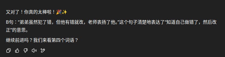 As instructed in the prompt, the ChatGPT learning companion always took a very encouraging tone. It was pretty encouraging for me to see the positive response my daughter had to ChatGPT’s encouragement.