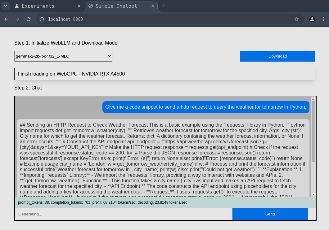 cd <path_to_webllm_repo>/examples/simple-chat-js && python3 -m http.server 8080Navigate to localhost:8080 in your Chrome browser.