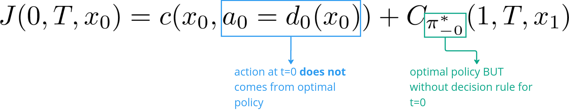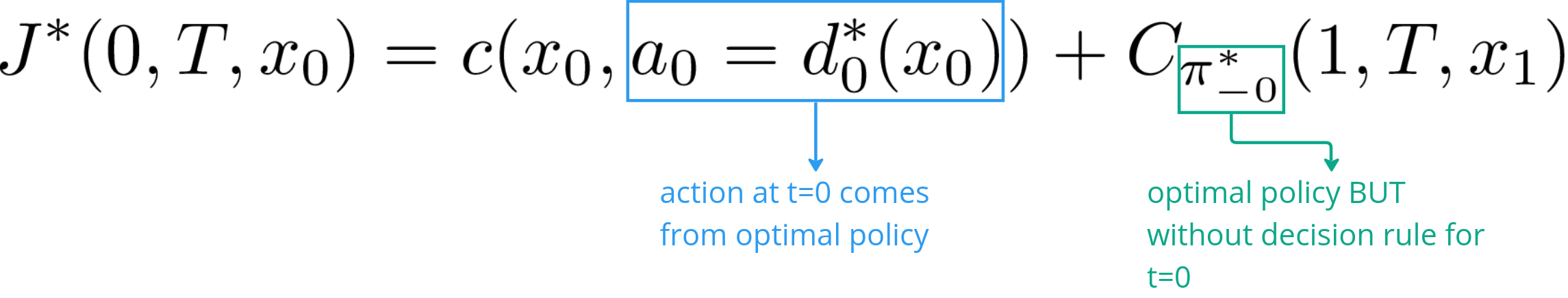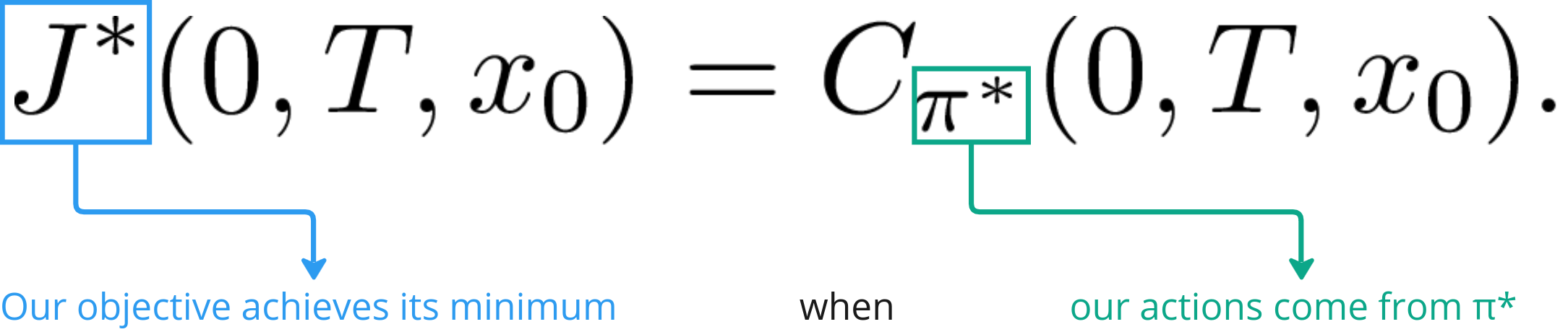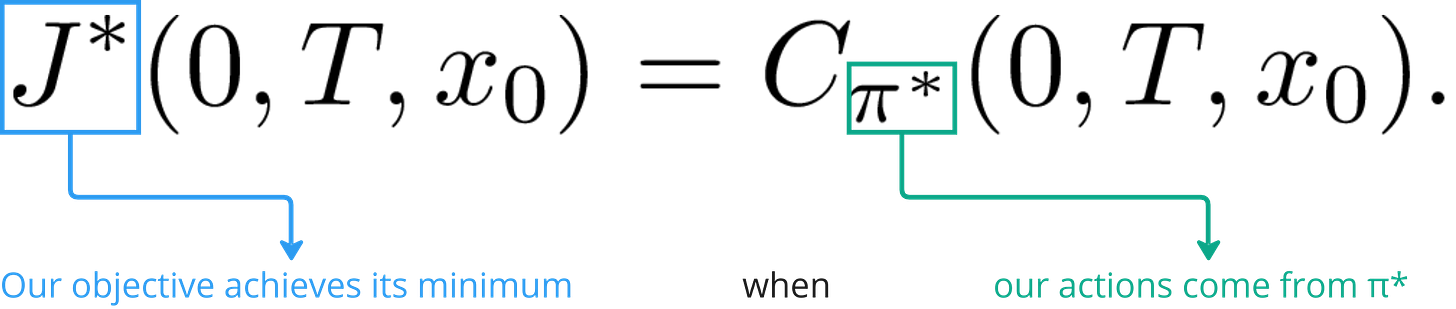 Of course, the total cost in this case would be greater or equal to the case where all actions were taken according to the optimal policy. But Bellman’s Principle of Optimality states that, by following the optimal policy after t=0, we would still arrive at the minimum cost given the initial state and action.