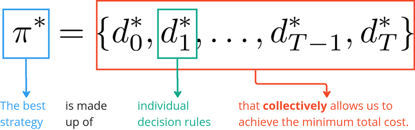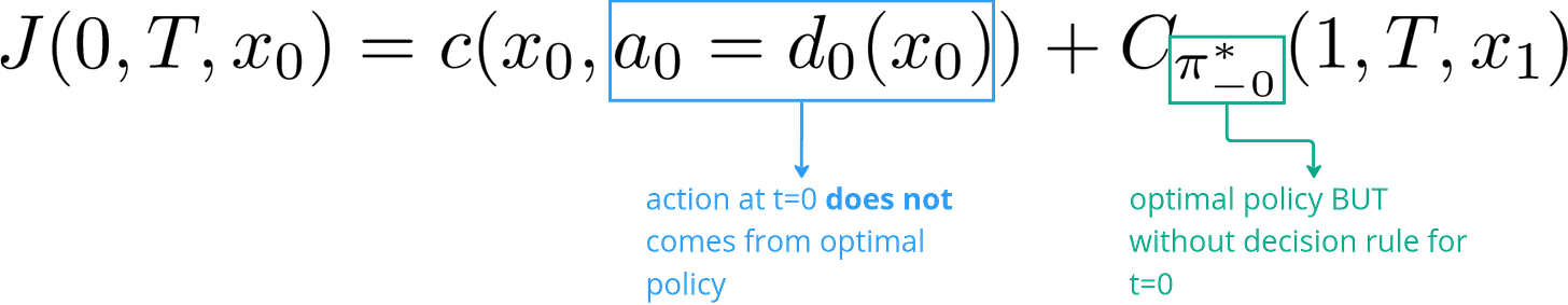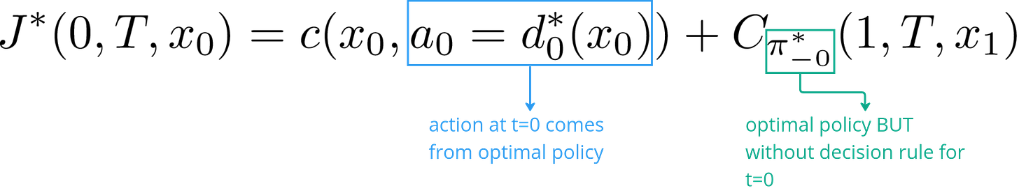 Two things to note here. Firstly, a policy is not a sequence of states. We do not specify the best path for the system to traverse through. Instead it is a sequence of decision rules (using our current nomenclature). That is why even if we didn’t make the optimal decision at t=0, our remaining policy decision rules will still be able to guide us to the best possible outcome given that we made a “mistake” initially by not following the optimal policy. Again, this does not mean that there is no cost to our mistake. The actual outcome would likely be worse than the optimal one just that it is the best that could have been achieved given the circumstances.