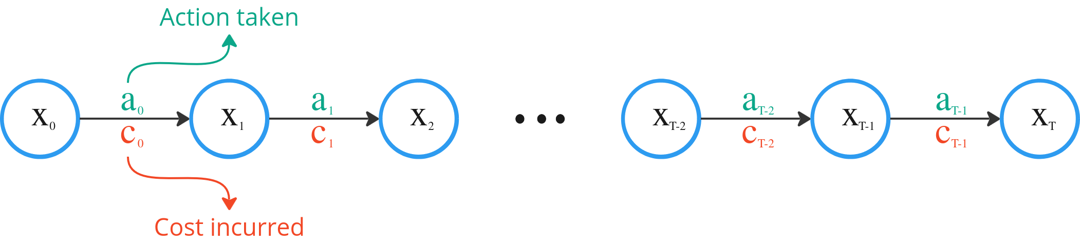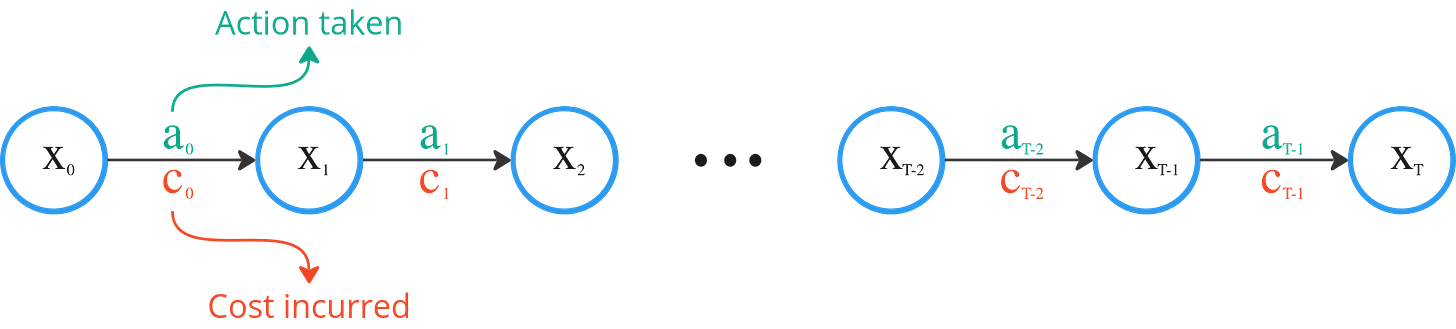Consider a decision problem over T time steps. At any given time t, our environment is described by a state xt. This “state” is simply the collection of “things” that tells us about the environment we are in. It could be temperature in the case of an oven. Or it could be the position, velocity and acceleration in the case of a car.