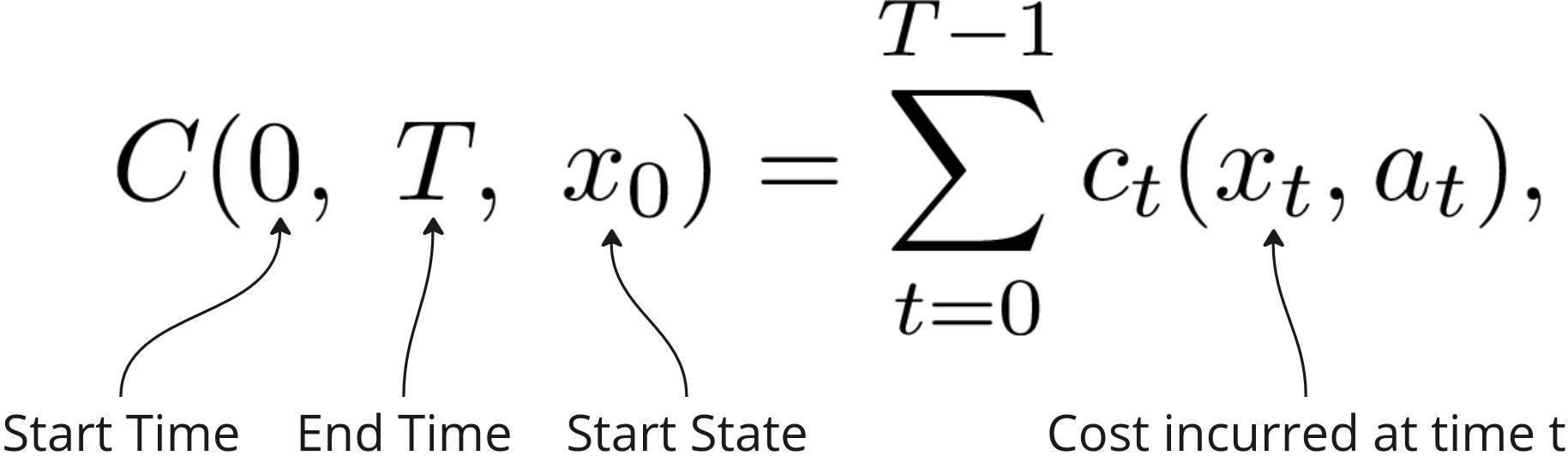 Thus we can express the total cost of all our actions over T time steps as a sum of all the costs incurred at each time step, C, as follows,