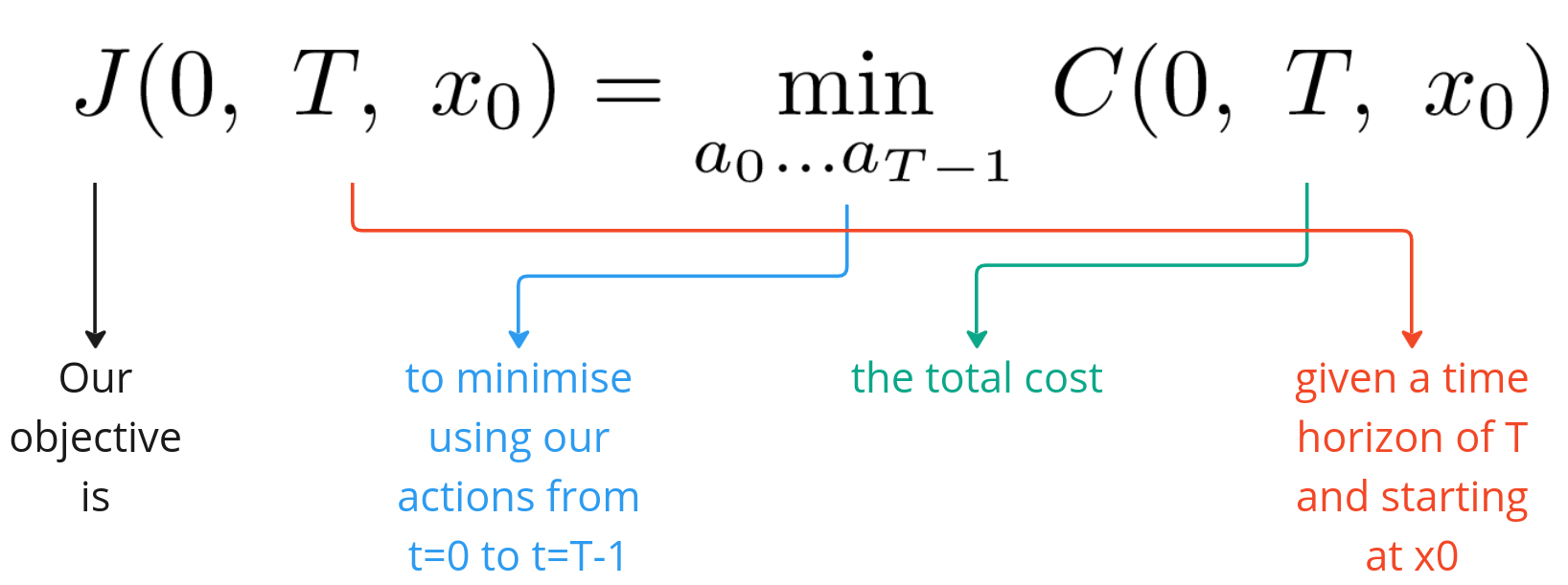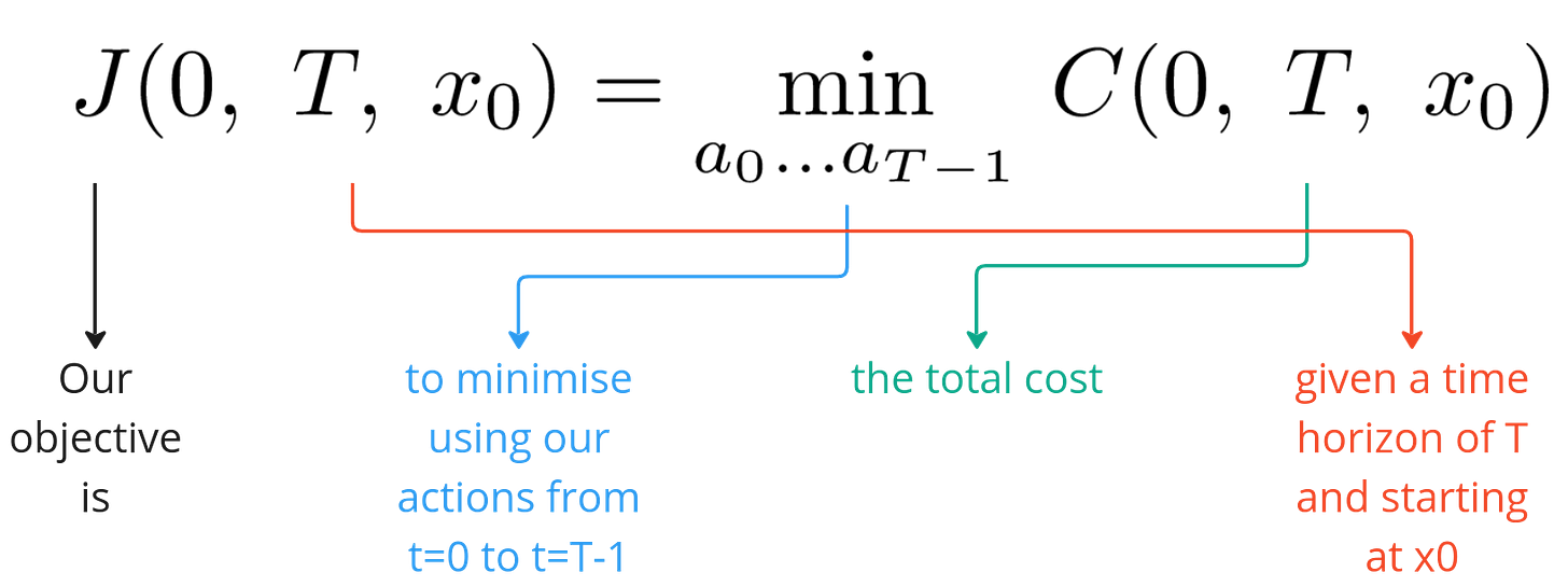 Our overall objective is to minimise the total cost over our time horizon T and is expressed below