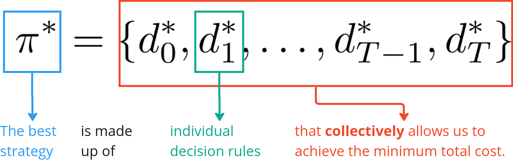Now suppose we are able to arrive at an optimal policy, π*, which gives us the best decisions rules that we can have such that the total cost is at its minimum. In other words,