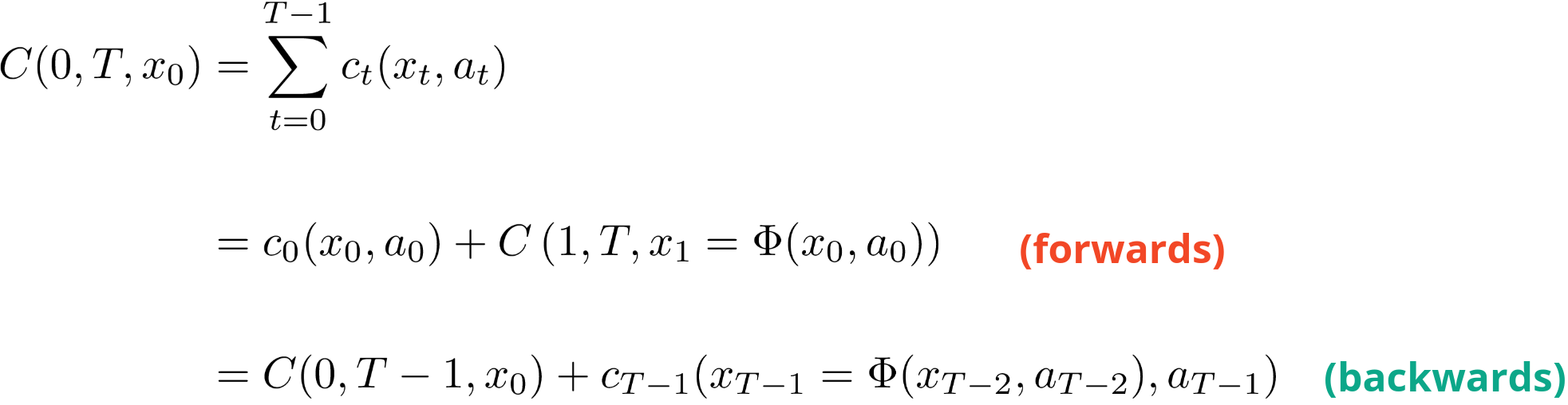 The second way is backwards in time, where we have the total cost up to the second last time step plus the cost at the last time. This is more like the planning way of thinking where we start with the end in mind and work our way back.